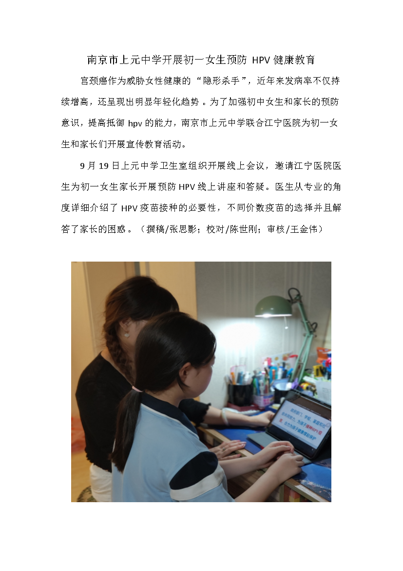 南京市上元中学开展初一女生预防HPV健康教育