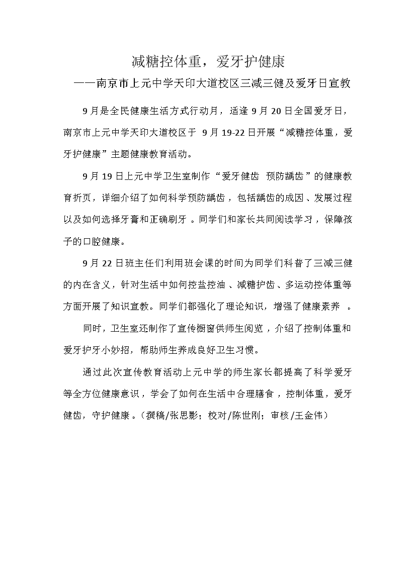 南京市上元中学天印大道校区开展三减三健及爱牙日宣传教育活动