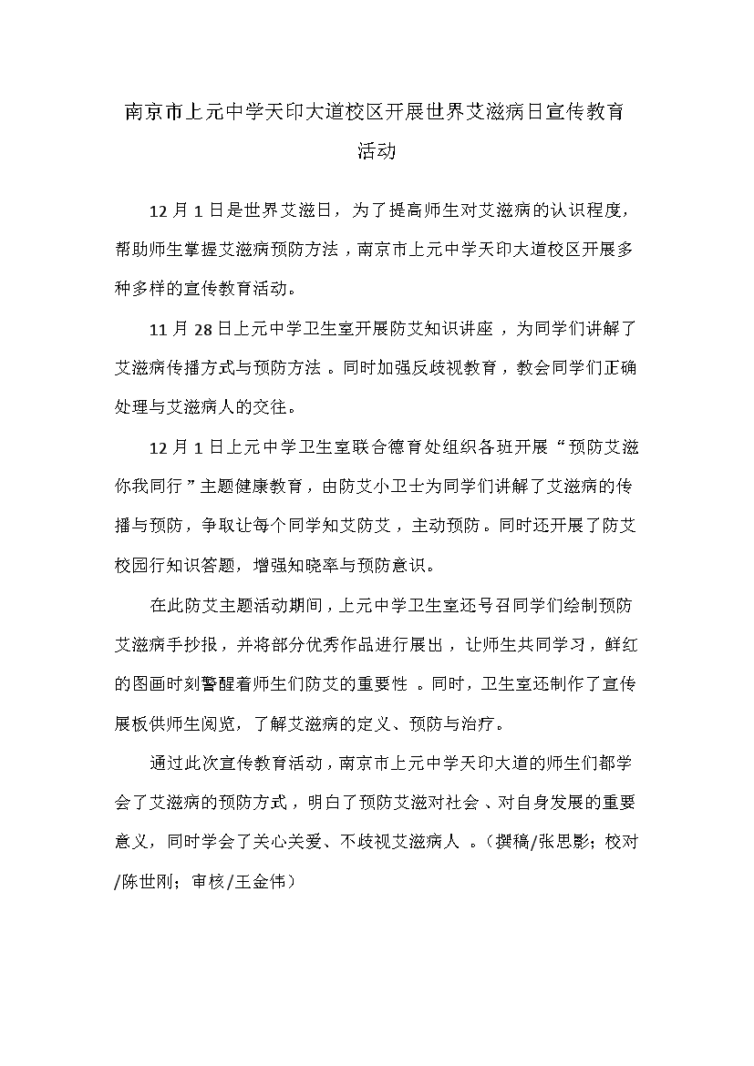 南京市上元中学天印大道校区开展世界艾滋病日宣传教育活动