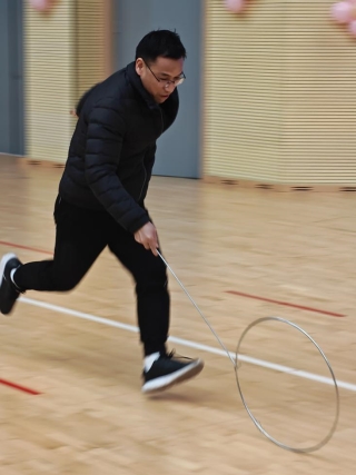 活动的尾声别开生面,充满了活力与欢笑。以年级为单位的滚铁环接力赛火热开赛。各年级派出十人代表队,在赛道上你追我赶。小小的铁环滚动着童年的记忆,也串联起同事间的默契与团结。最终,初二年级组奋勇夺冠。各年级组的代表们分别为自己的团队赢得了小音箱、翻页笔、靠枕等实用又贴心的奖品,现场成为一片欢乐的海洋。